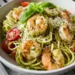A delightful combination of succulent shrimp and vibrant pesto sauce served over perfectly cooked pasta.