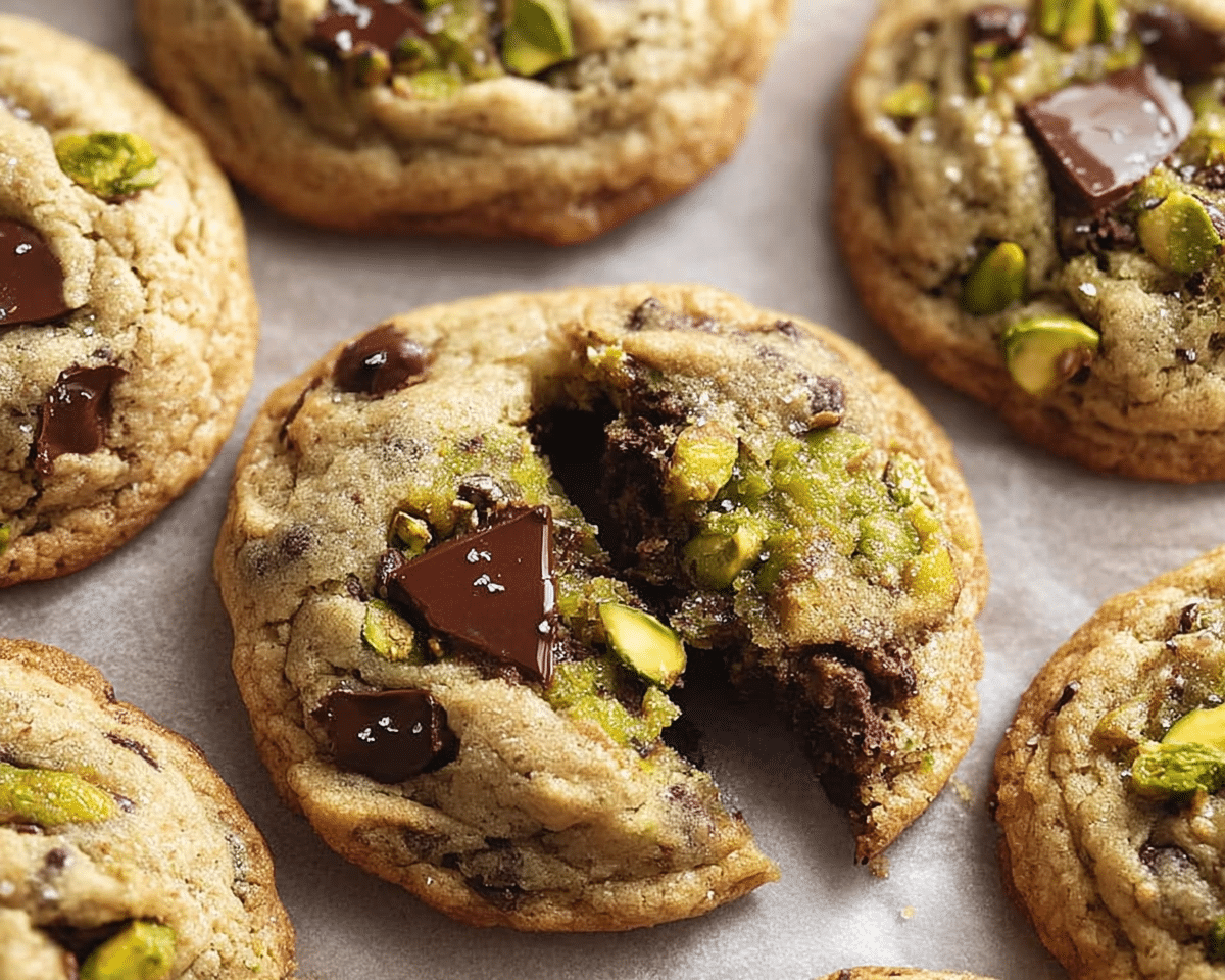 Deliciously gooey pistachio cream chocolate chip cookies perfect for spring desserts.