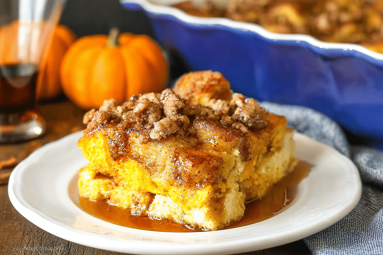 A delicious and easy-to-make pumpkin French toast casserole perfect for autumn breakfasts.