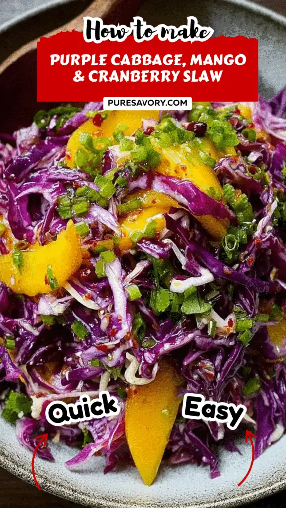 This Purple Cabbage, Mango & Cranberry Slaw is perfect for busy families looking for quick, nutritious meals, health-conscious cooks who want to incorporate more vibrant ingredients, and food lovers eager to explore easy, delicious recipes that brighten up their dining experience.