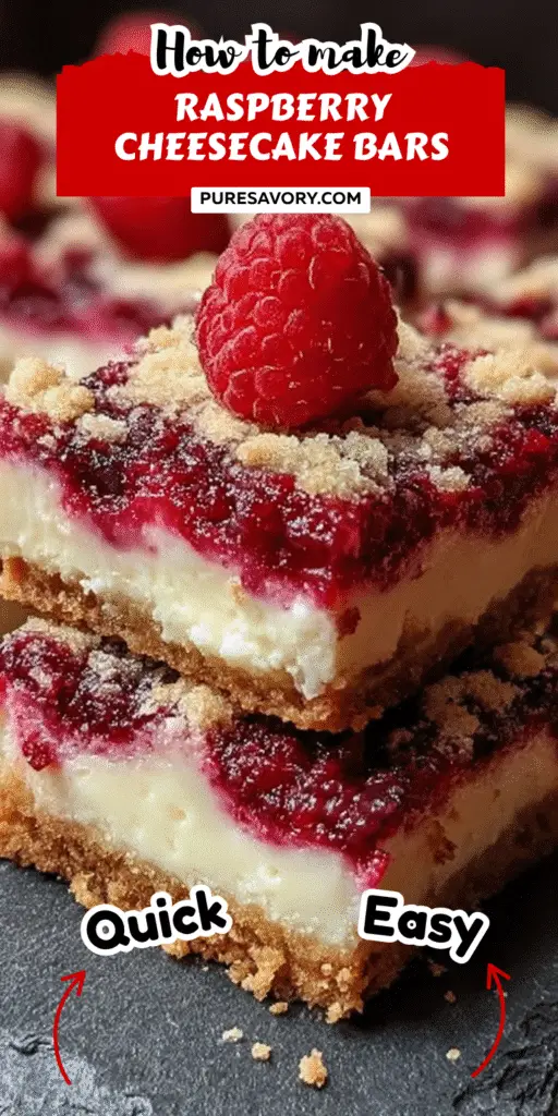 Keywords: Raspberry Cheesecake Bars, raspberry cheesecake bars recipe, easy cheesecake dessert, no-bake raspberry dessert, homemade cheesecake bars, creamy raspberry dessert, party dessert ideas, raspberry swirl cheesecake