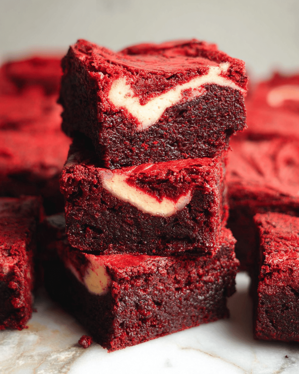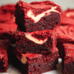 Deliciously rich and fudgy red velvet brownies with a hint of cocoa and a cream cheese swirl.