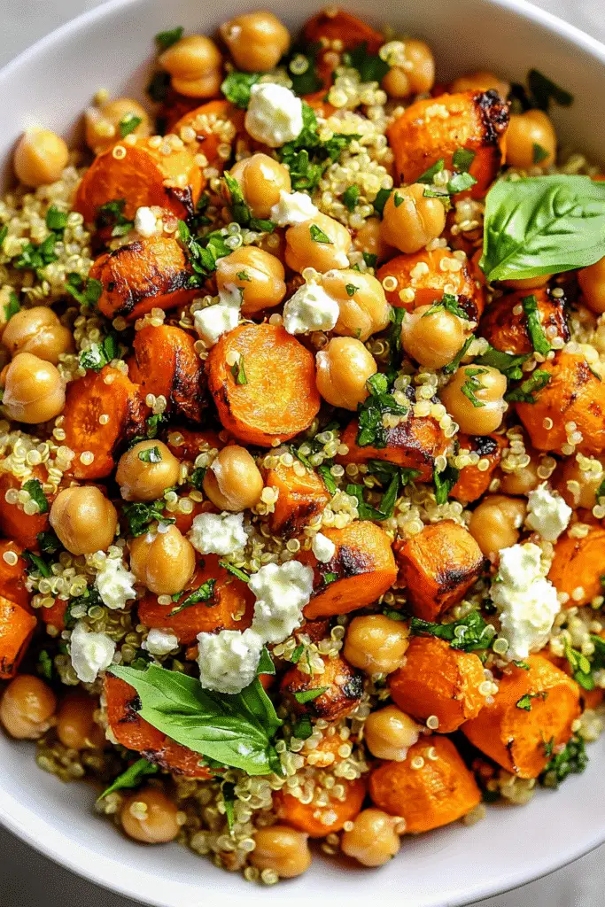 A nutritious and flavorful salad featuring roasted carrots, quinoa, and chickpeas, topped with a zesty lemon dressing.