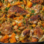 A delicious one-pan recipe featuring roasted chicken, leeks, and butternut squash.