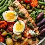 This dish typically features a mix of vibrant greens, boiled eggs, olives, and sometimes anchovies, complemented by a drizzle of olive oil or vinaigrette. Roasting the salmon adds a lovely caramelization, enhancing its flavor and marrying perfectly with the other fresh ingredients. This classic recipe warm-heartedly invites you to gather around the table for a shared dining experience.