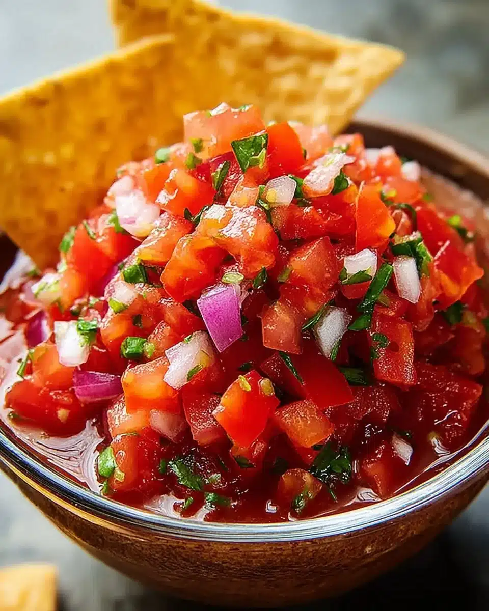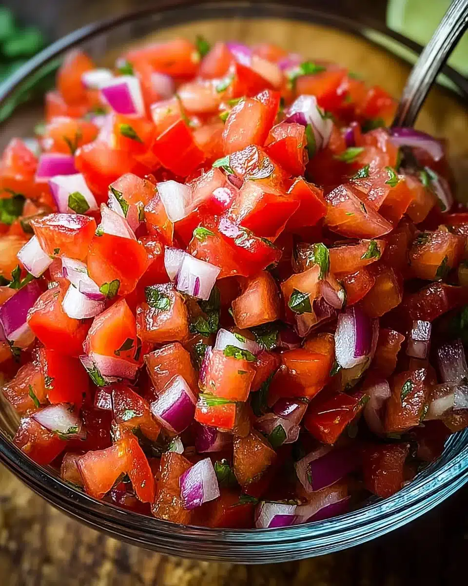 A fresh salsa-like dish bursting with flavors from vibrant tomatoes, zesty jalapeños, and fragrant cilantro, perfect for gatherings.
