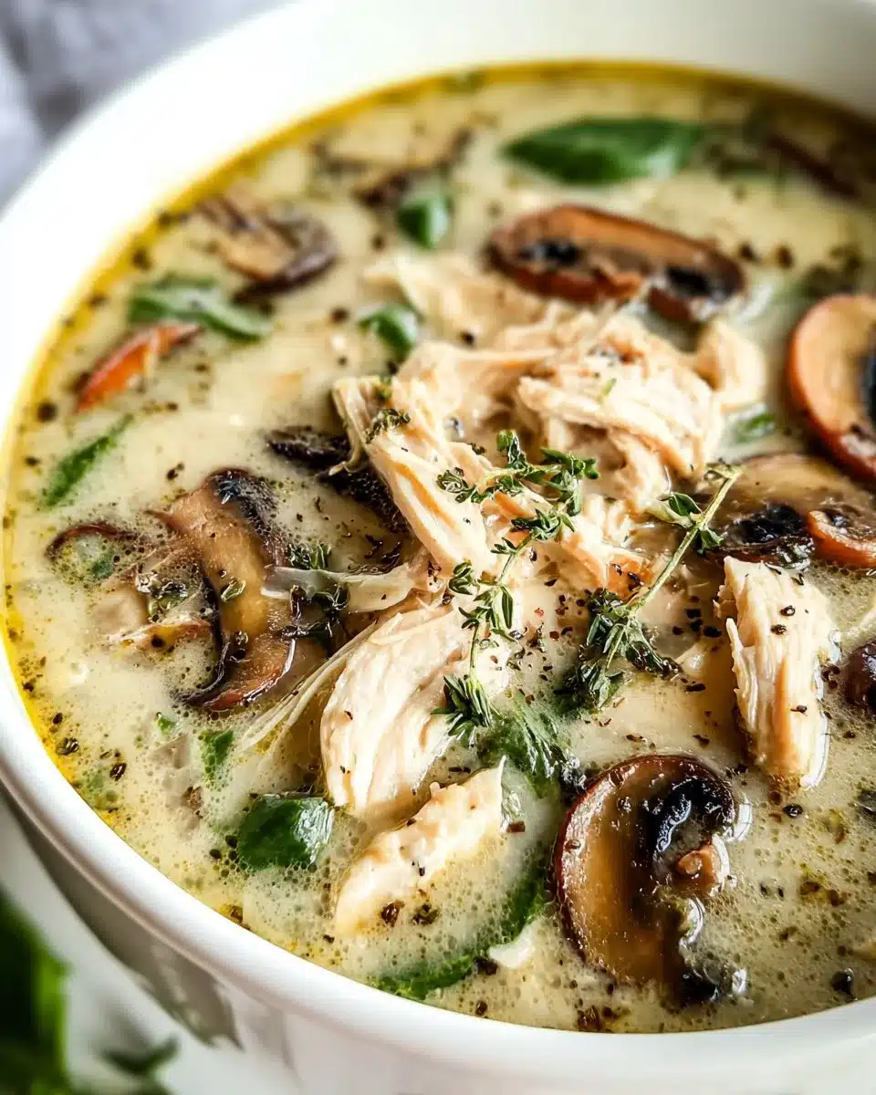 A comforting and wholesome one-pot soup featuring tender rotisserie chicken and earthy mushrooms, perfect for cozy meals.