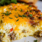 A hearty and flavorful breakfast casserole featuring savory sausage and melted cheese, perfect for starting your day.