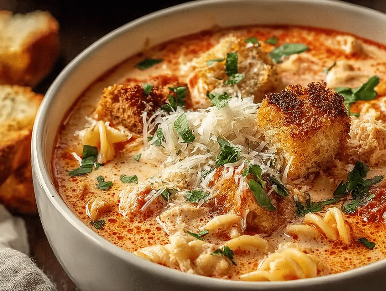 A hearty and delicious soup that combines the flavors of chicken parmesan in a comforting bowl.