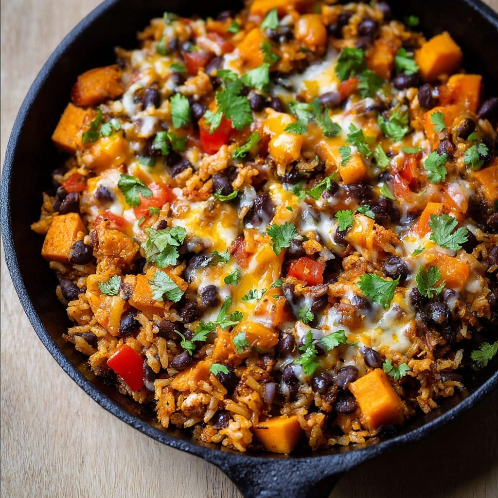 A delicious and nutritious one-pan meal featuring sweet potatoes, black beans, and rice with a Southwest twist.