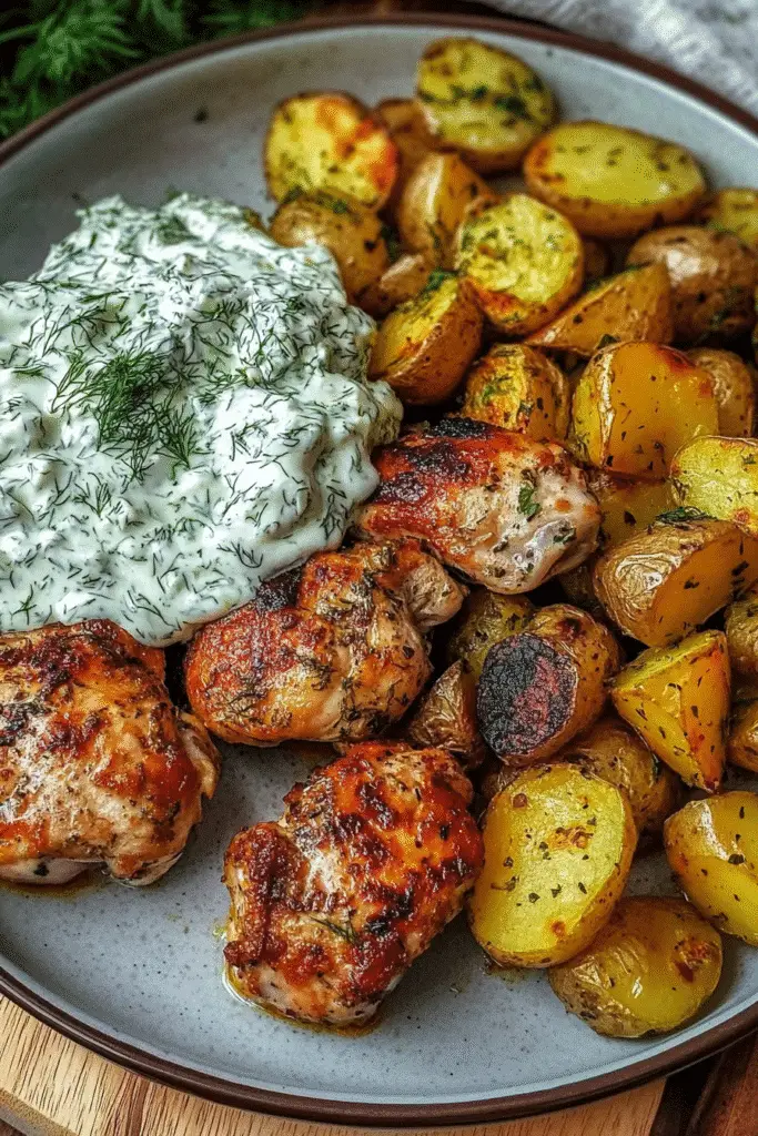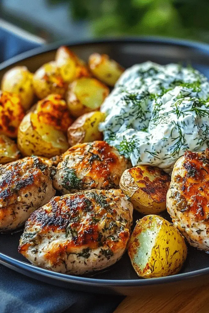 A delicious and flavorful dish featuring marinated chicken served with a creamy dill feta sauce and crispy baby potatoes.