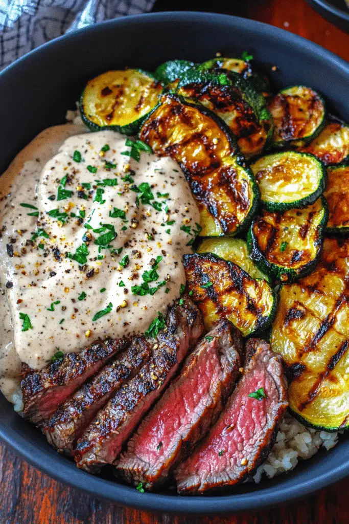 Steak Bowl with Creamy Sauce & Grilled Zucchini: A Delicious Recipe to Try!