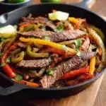 A vibrant and flavorful Mexican dish featuring marinated flank steak, sautéed peppers, and onions served in warm tortillas.