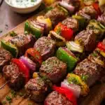Delicious grilled steak kabobs, marinated to perfection and loaded with vibrant vegetables.