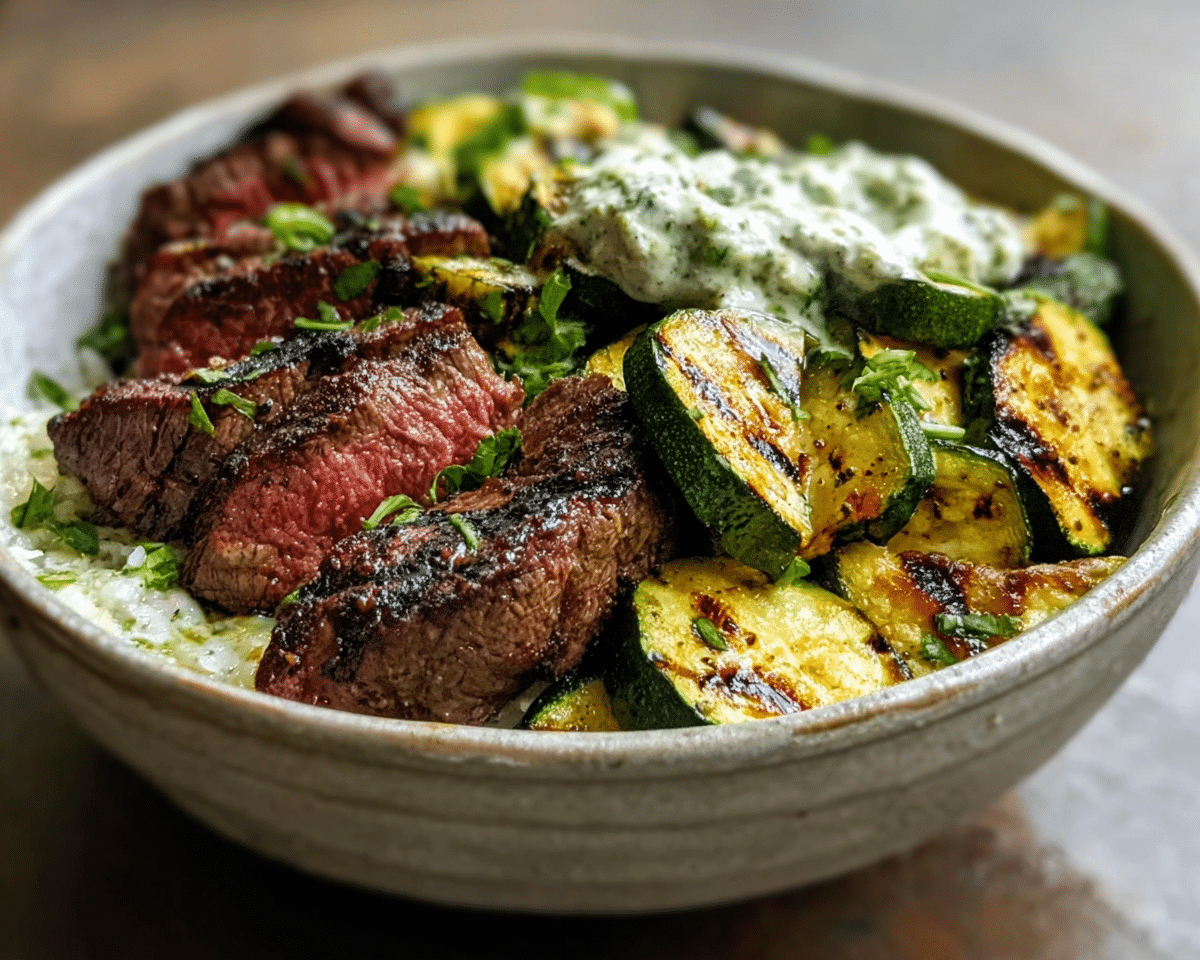 This bowl is not just a meal; it’s a canvas for creativity. You can easily customize it with seasonal vegetables or your favorite sauces, making it a versatile option for any palate. The creamy dressing drizzled over the top adds a rich, savory element that complements the grilled steak beautifully. Whether you’re preparing a grilled steak bowl with creamy sauce for a family dinner or a quick meal for two, the Steak Zucchini Bowl embodies the essence of healthy, easy dinner meals that are both nourishing and satisfying.