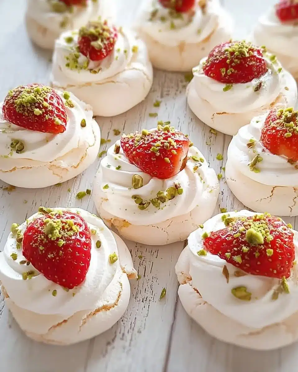Delightful meringue bites topped with creamy cardamom and fresh strawberries, perfect for any occasion.