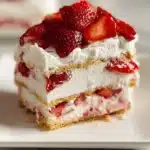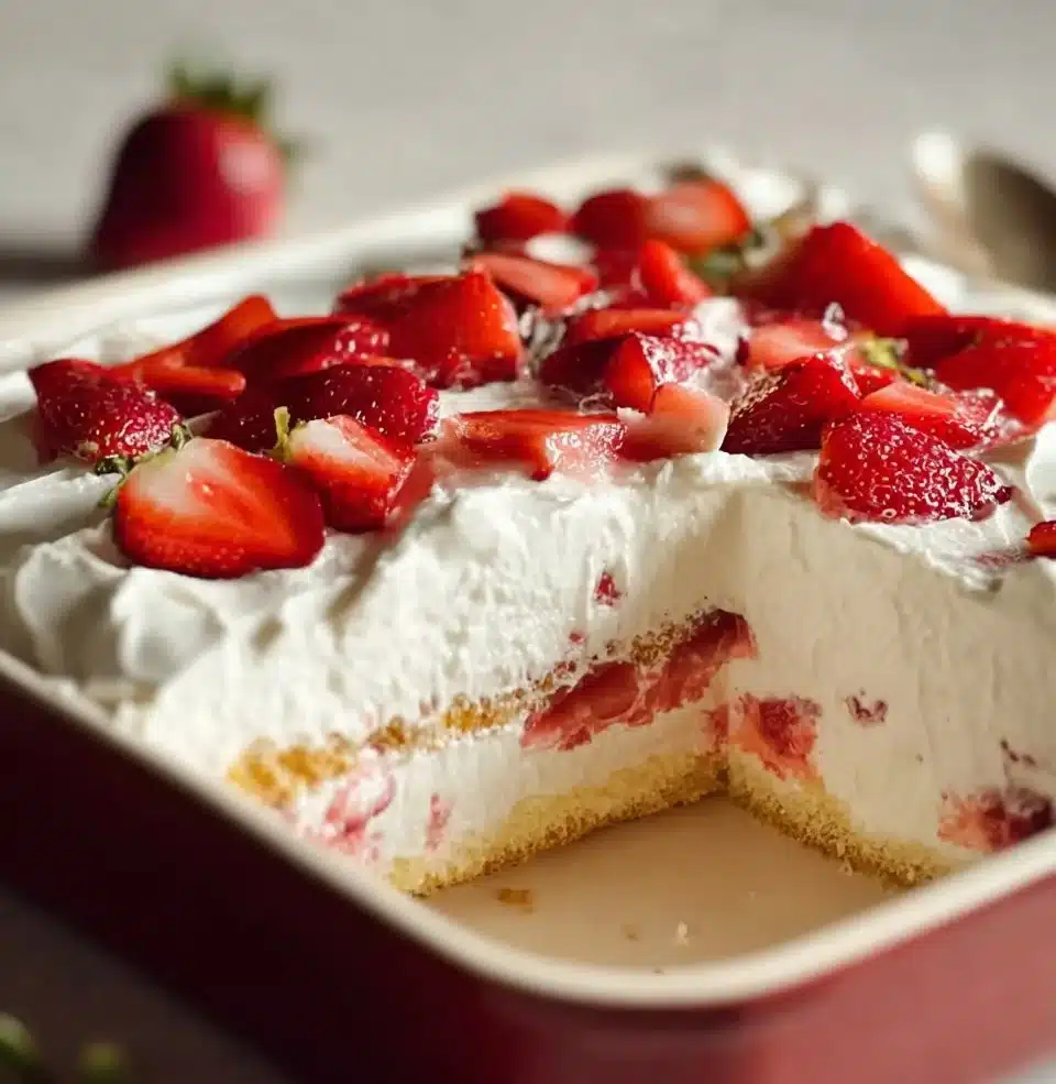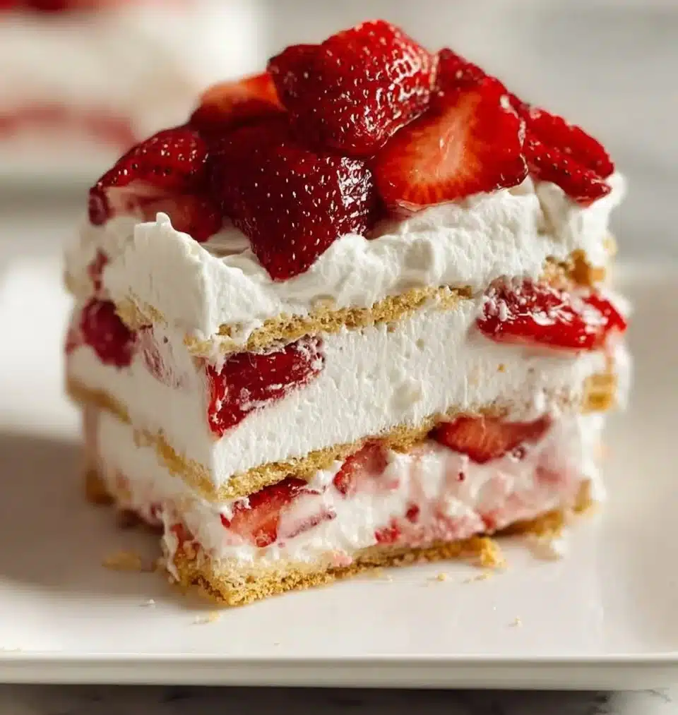 A nostalgic no-bake dessert featuring layers of creamy filling, fresh strawberries, and crispy cookies.