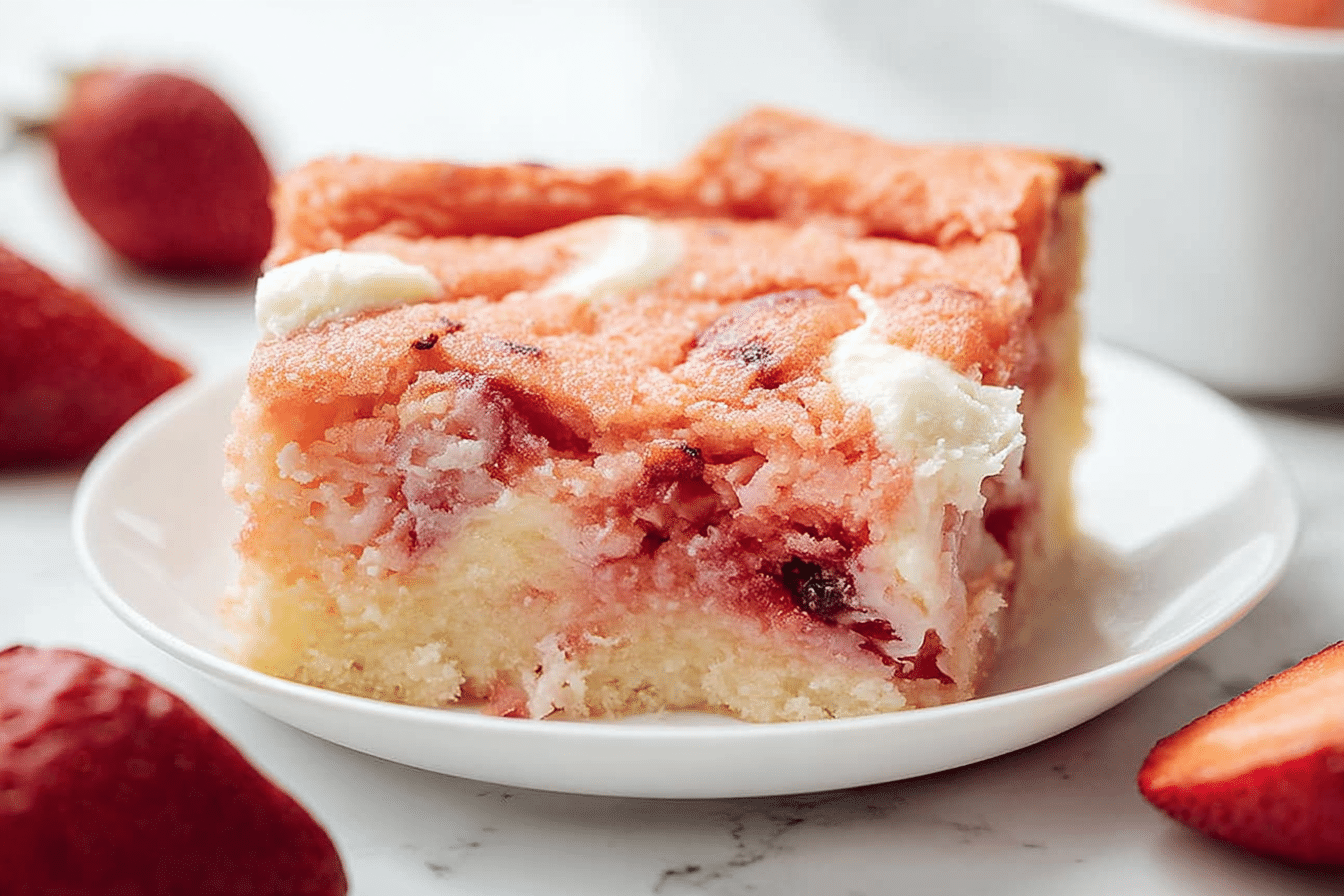 A gooey, nostalgic Southern dessert made with white cake mix, cream cheese, strawberries, and coconut. This scoopable cake is as dramatic as it is delicious, with crackled tops and sweet, jammy pockets.