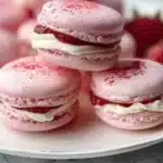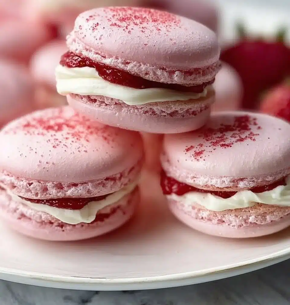 Delicate and colorful Strawberry Shortcake Macarons filled with luscious strawberry buttercream, perfect for summer gatherings.