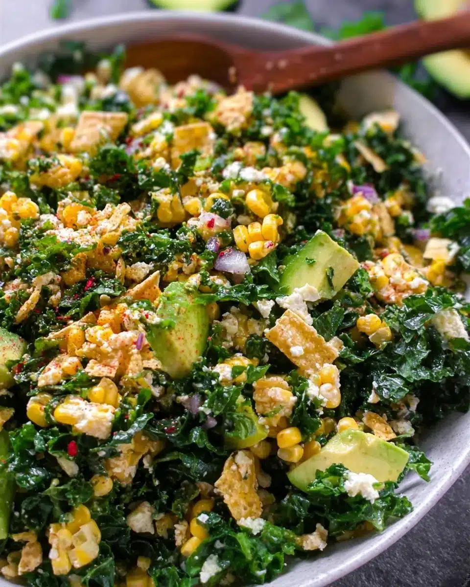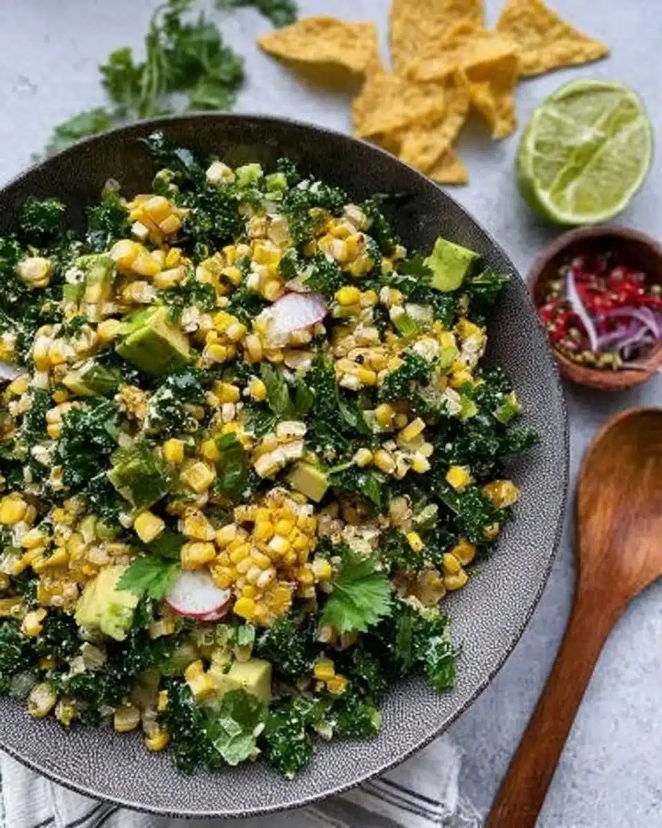 A vibrant and healthy salad that combines kale with sweet corn and creamy avocado, perfect for summer gatherings.