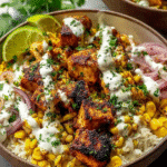 A flavorful and satisfying street corn chicken bowl recipe that combines grilled chicken, fresh corn, and zesty toppings.