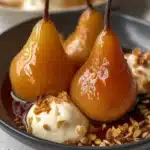 Tender pears poached in a sweet vanilla and bourbon syrup, perfect for a cozy dessert.