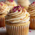 - While the cupcakes are baking, prepare the rose frosting by beating the vegan butter until creamy, then gradually add the powdered sugar and rose water, mixing until smooth. Add almond milk as needed to reach desired consistency.