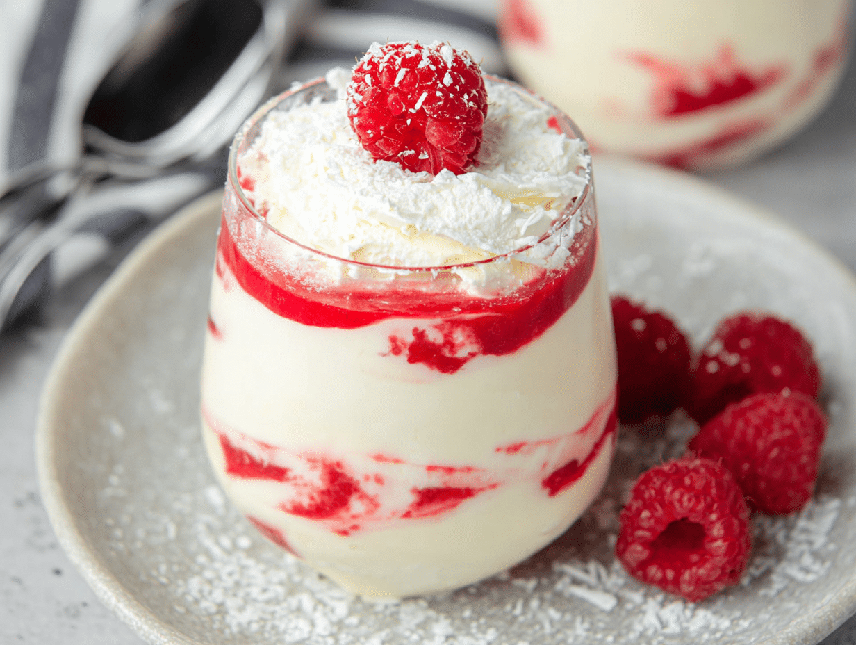 A delightful and creamy dessert that combines the rich flavor of white chocolate with the tartness of fresh raspberries.